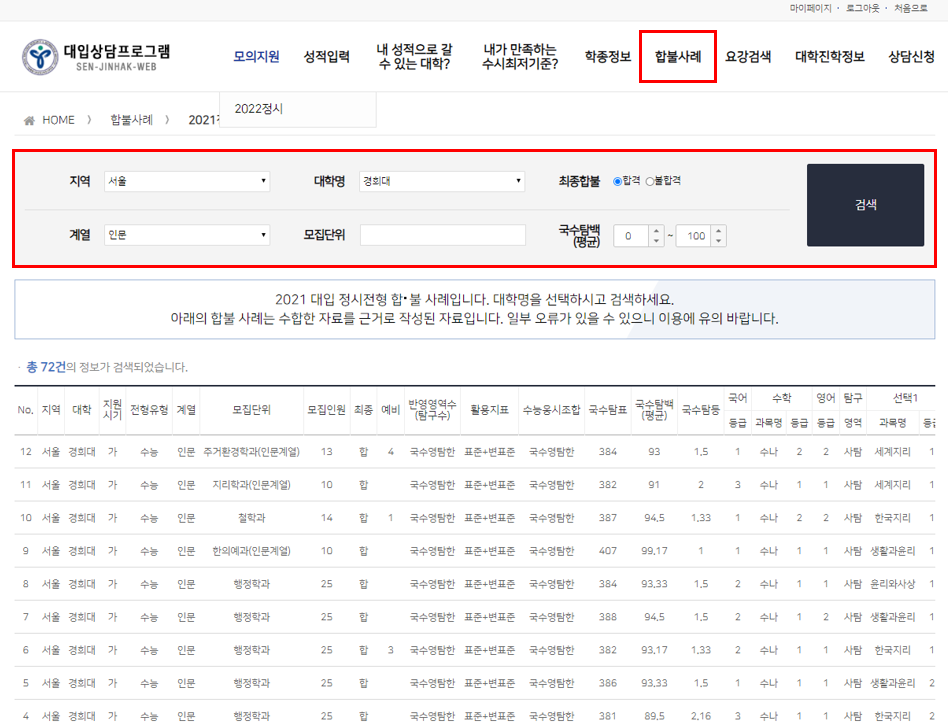 대입 상담프로그램 화면 상단에서 '합불사례' 메뉴를 이용해서 확인할 수 있다. 지역, 계열, 관심 대학, 최종합불(합격)을 선택한 후 검색을 누르면 합격한 학생들의 실제 점수가 리스팅된다.