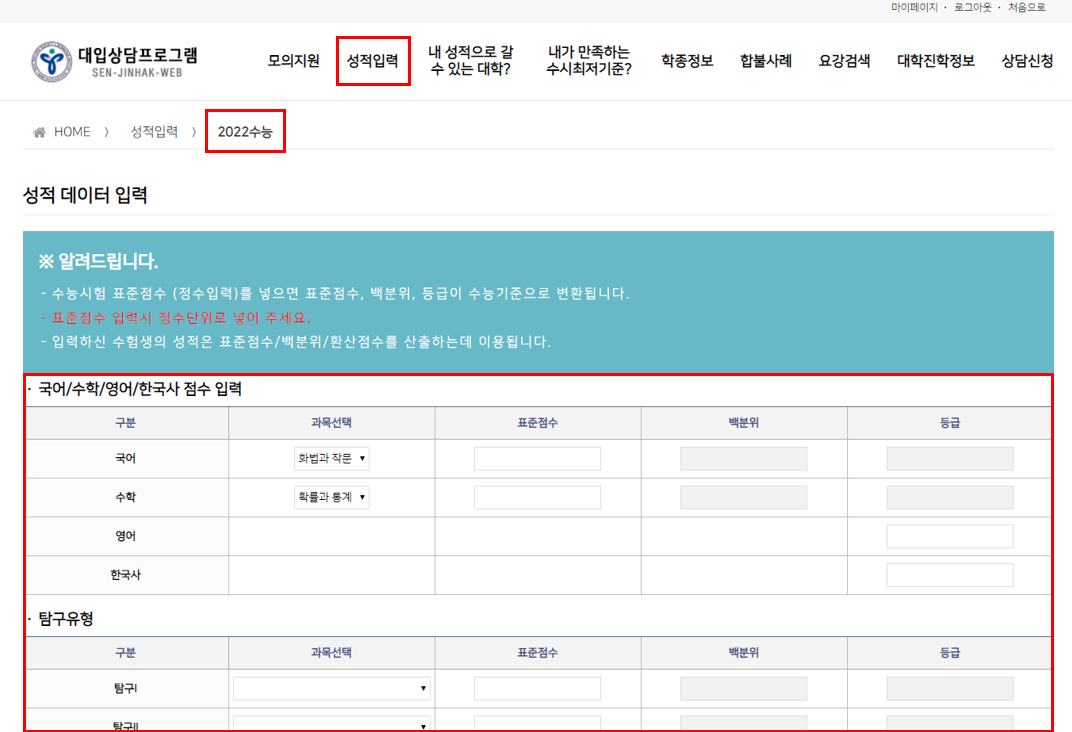 서울 진로 진학 정보센터 홈페이지 상단 메뉴에서 진학 상담프로그램 메뉴를 선택한다. 대입 상담프로그램 화면 상단의 '성적입력' 메뉴에서 성적 데이터를 과목별로 입력한다. 현재는 2022 수능과 2021년도에 실시한 모의고사 성적을 입력할 수 있다.