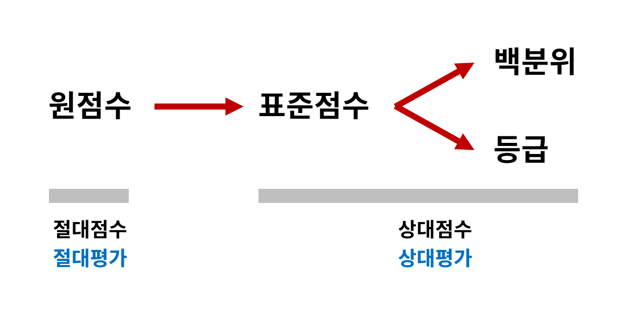 수능 성적표를 보면 과목별 원점수 대신 표준점수, 백분위, 등급이 표시된다. 수능에 원점수가 표시되지 않는 이유는 상대평가 위주로 평가하기 때문이다. 상대평가에서는 '원점수'로 판단하는 것이 아니라 소속된 집단 내에서의 '상대적 위치'로 판단해야 한다.