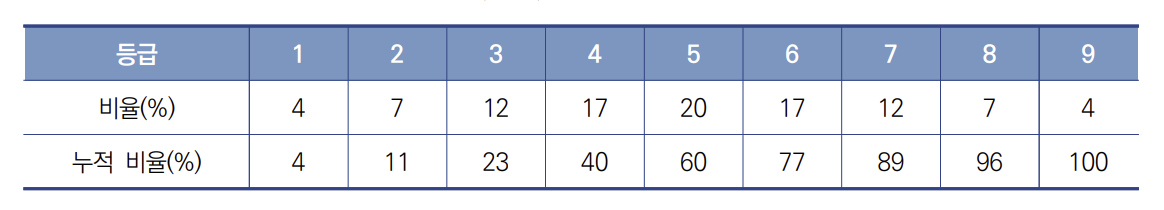 수능에서는 상대평가, 절대평가 모두 9등급제로 이루어져 있다. 상대평가의 경우 정해진 비율로 등급이 정해지는데 등급 기준은 표준점수를 토대로 하며, 등급 간 비율은 아래 표와 같다.