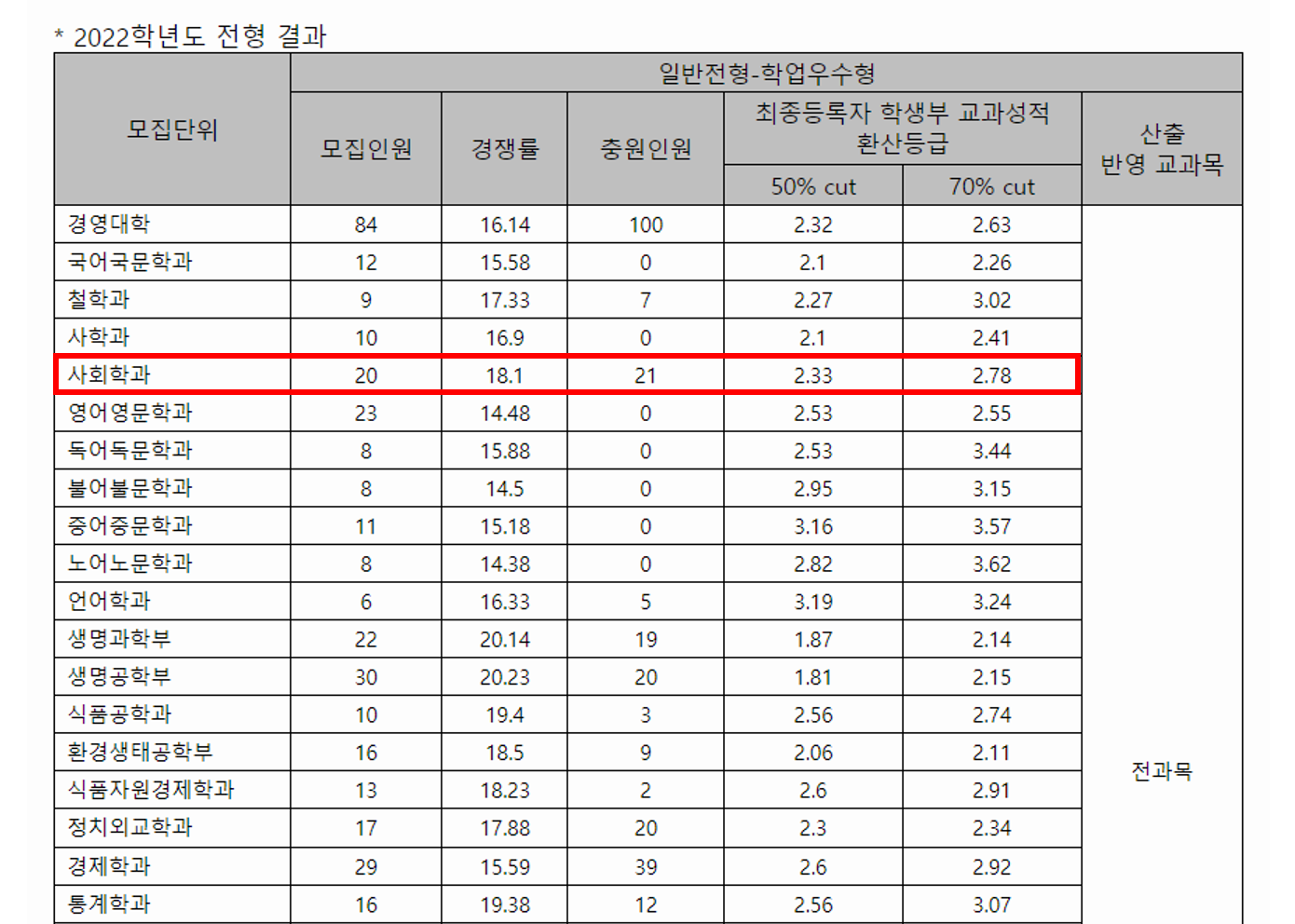 - 경쟁률 : 모집인원 대비 지원자 수를 파악할 수 있다. 사회학과의 경우 경쟁률이 18.1:1이므로 지원자 수는 362명이다. (20 x 18.1 = 362)